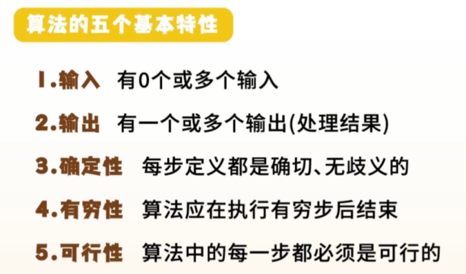 算法的概念与特性:算法是解决特定问题或执行特定任务的明确计算步骤。有五个特性,输入、输出(可无输入但必有输出)、确定性(每步清晰无歧义)、有限性(有限步骤后终止)、可行性(每步可执行)。